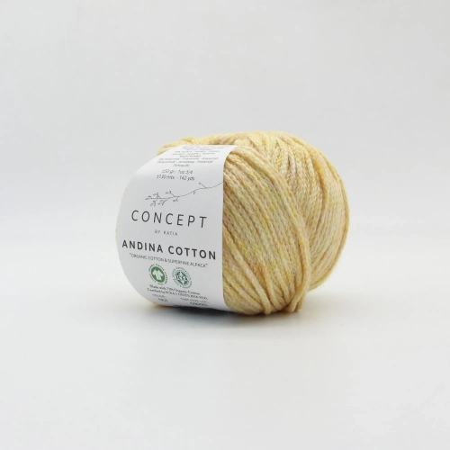 Andina Cotton — это довольно теплая цепочная пряжа из мягкого хлопкового волокна с вкраплениями цвета Alpaca Superfine. Добавьте нежную атмосферу своим трикотажным изделиям с красочным эффектом Andina Cotton. Легко и быстро вяжите изделия, которые будут максимально мягкими и удобными, благодаря пряже Andina Cotton, сертифицированной GOTS.