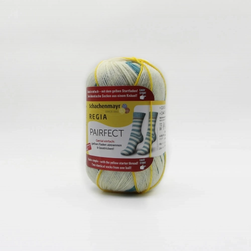 Пряжа для вязания одинаковых носков - близнецов. Внутри мотка есть отделяющая нить желтого цвета, которая позволяет связать носки одинаковой расцветки.
