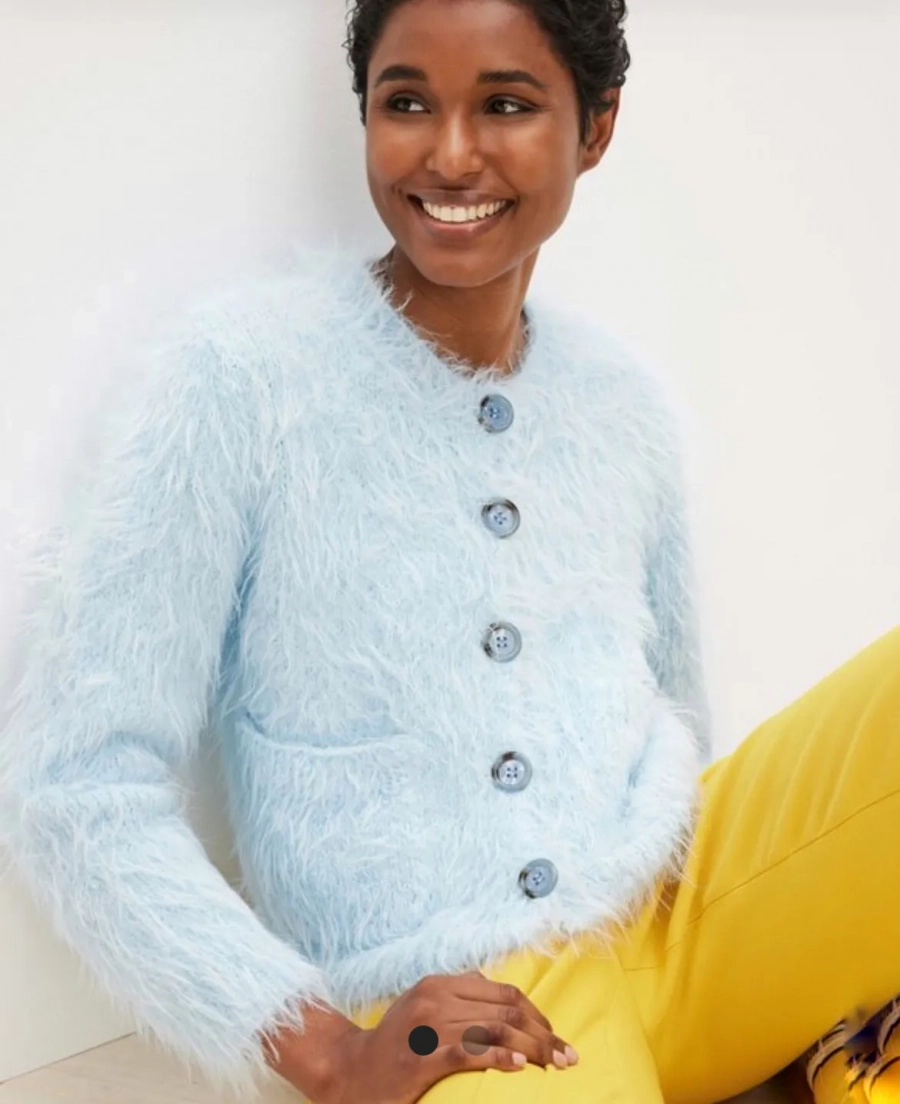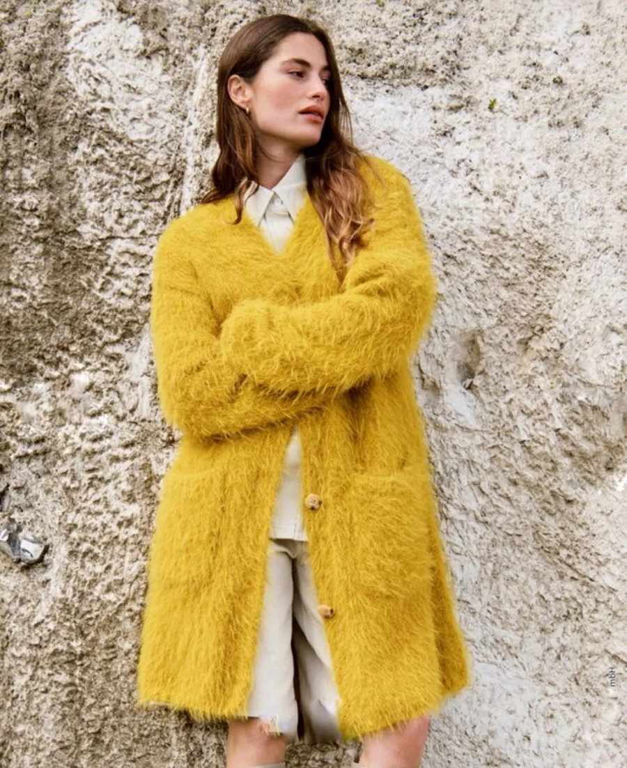Вяжите из нее теплую панамку, длинный шарф (расход два мотка), джемпер или длинный кардиган. Расход пряжи на плечевое изделие от 9 мотков. Вязание получится быстрым, юлагодаря рекомендованным спицам 6мм.