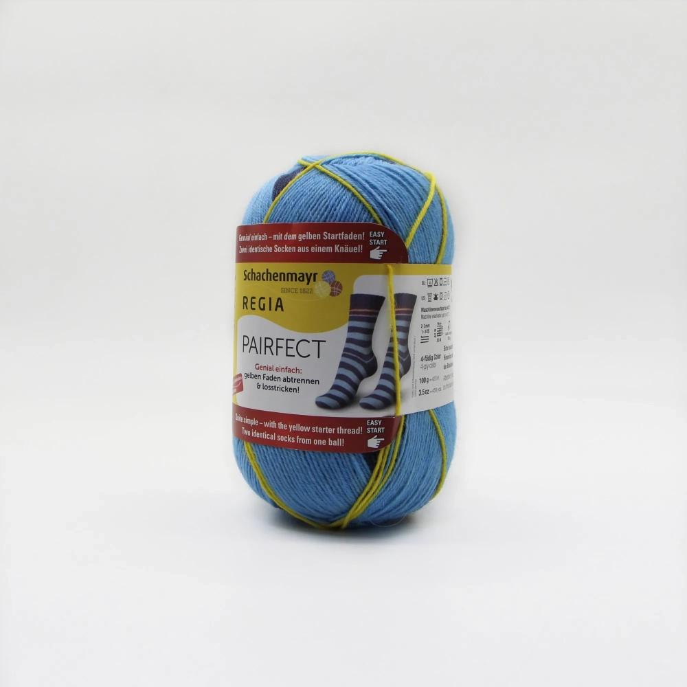 Пряжа для вязания одинаковых носков - близнецов. Внутри мотка есть отделяющая нить желтого цвета, которая позволяет связать носки одинаковой расцветки.