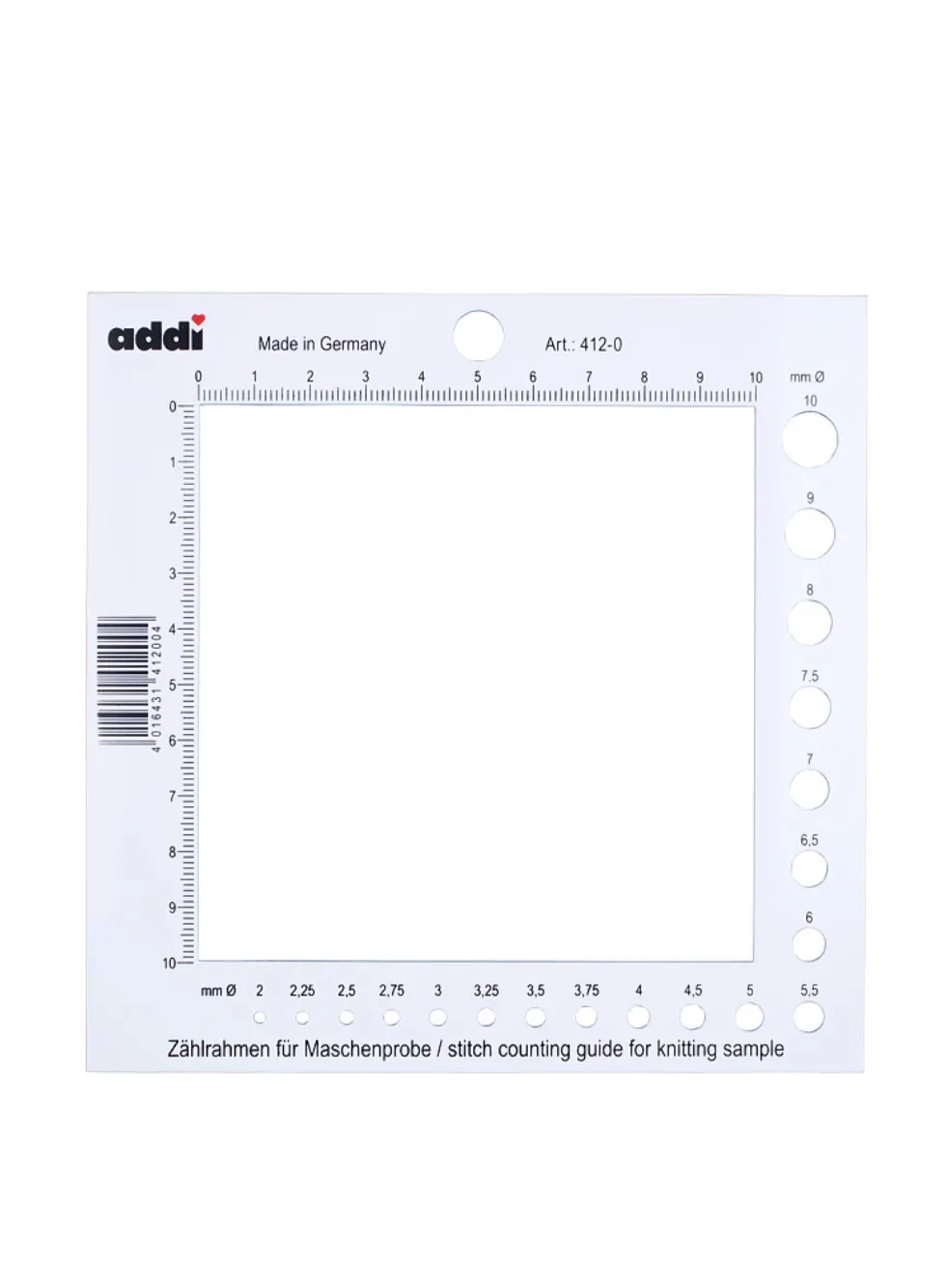 Счетная рамка для спиц торговой марки addi изготовлена из особо прочного гибкого пластика. Помогает точно рассчитать количество петель и рядов в образце. Также содержит измеритель спиц.